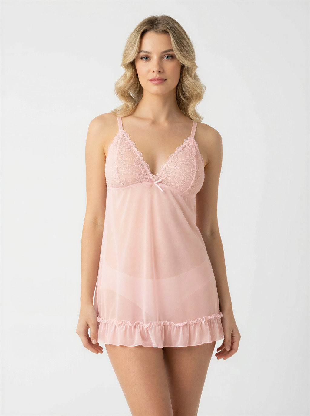 Világos babarózsaszín árnyalatú, extra puha és finom csipkéből készült kombiné, amely gyengéden simul a testre. Merevítő és szivacs nélküli kialakítása maximális kényelmet biztosít, miközben nőies és nőies megjelenést kölcsönöz. A hozzáillő G-string tanga teljessé teszi az összhatást.