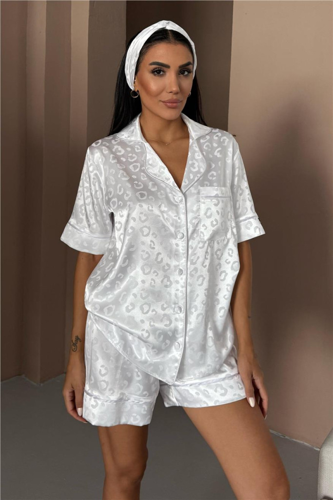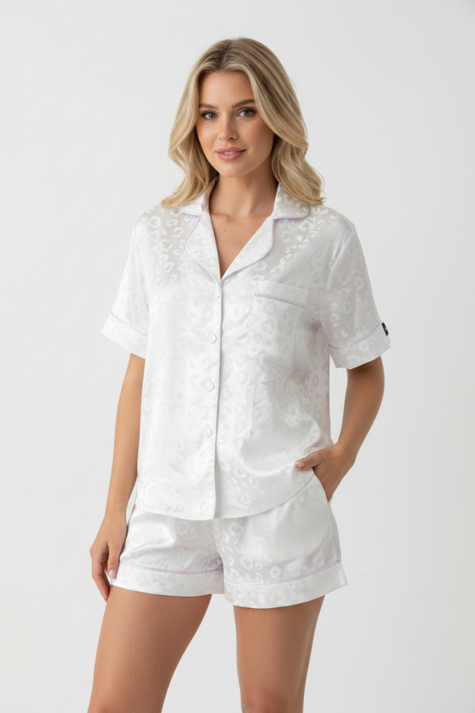 COCO fehér mintás szatén hálóruha short szett kényelmes és elegáns éjszakai viselethez.