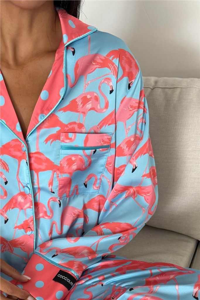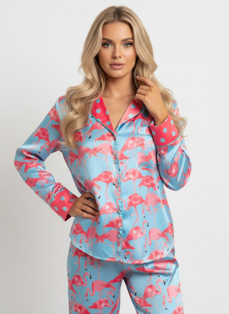 COCO flamingó mintás szatén hálóruha szett kényelmes és elegáns éjszakai viselethez.