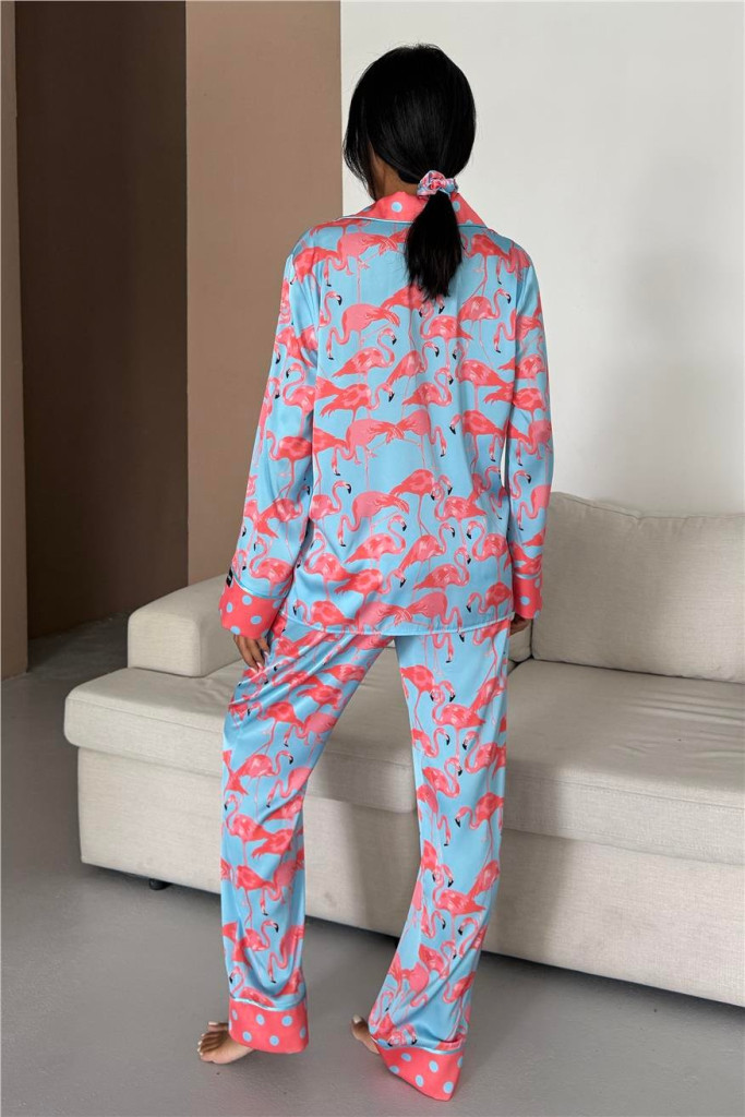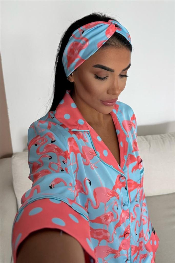 COCO flamingó mintás szatén hálóruha szett kényelmes és elegáns éjszakai viselethez.