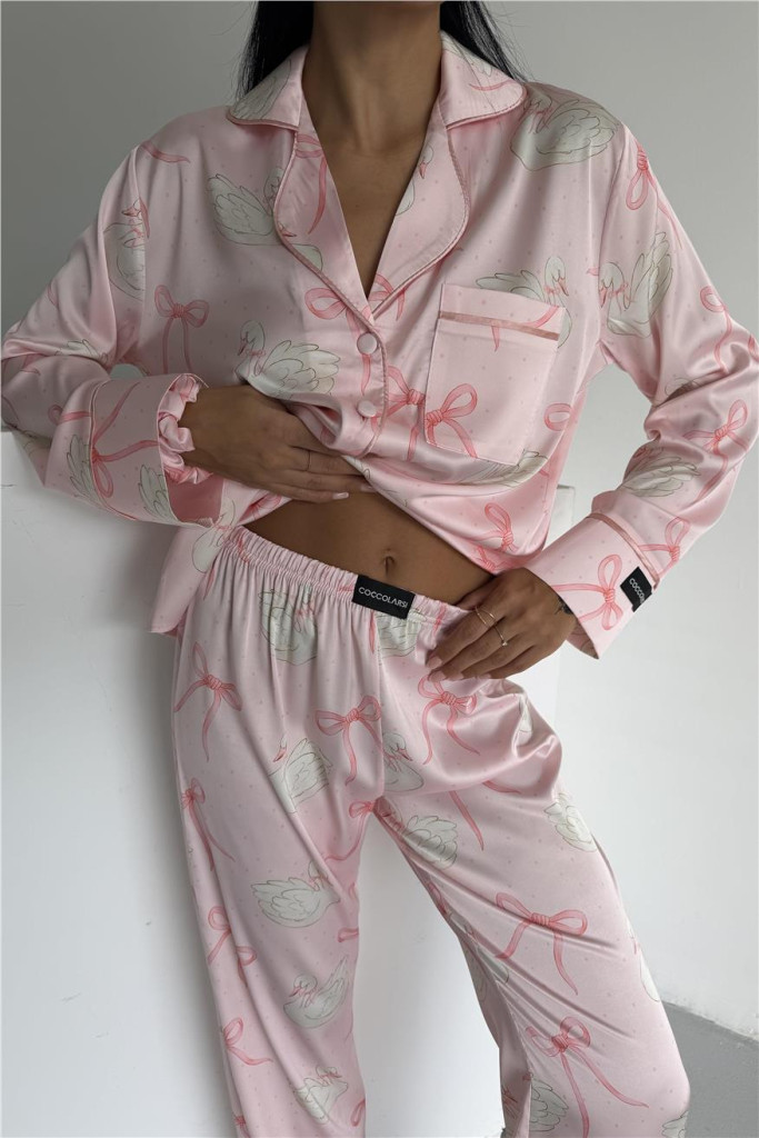 Kifinomult megjelenésű, hattyú mintás szatén hálóruha szett, amely tökéletes egyensúlyt teremt az elegancia és a kényelem között.