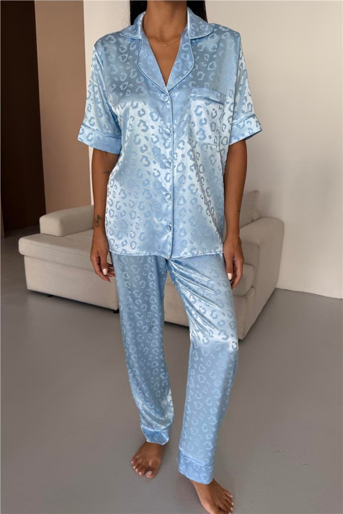 A szett egy gombos felsőrészből és egy hosszú nadrágból áll, melyek letisztult, harmonikus összhatást alkotnak. A selymes tapintású, könnyed szatén anyag nem feszül, kellemes viseletet biztosít, míg a laza szabás maximális komfortot és szabad mozgást nyújt.