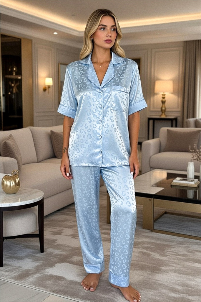 A szett egy gombos felsőrészből és egy hosszú nadrágból áll, melyek letisztult, harmonikus összhatást alkotnak. A selymes tapintású, könnyed szatén anyag nem feszül, kellemes viseletet biztosít, míg a laza szabás maximális komfortot és szabad mozgást nyújt.