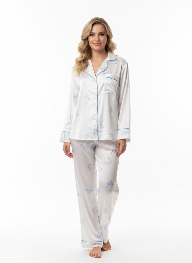 Fehér alapon kék pillangó mintás szatén hálóruha szett, amely friss, nőies megjelenést és luxus érzetet nyújt.