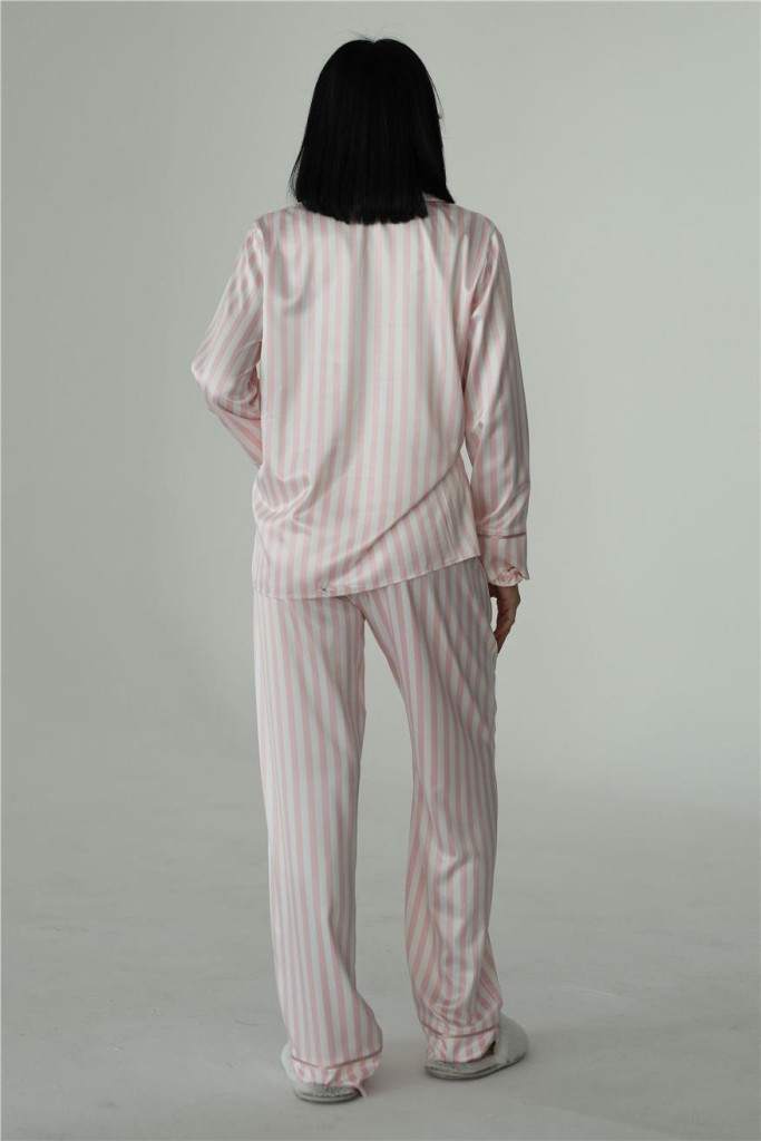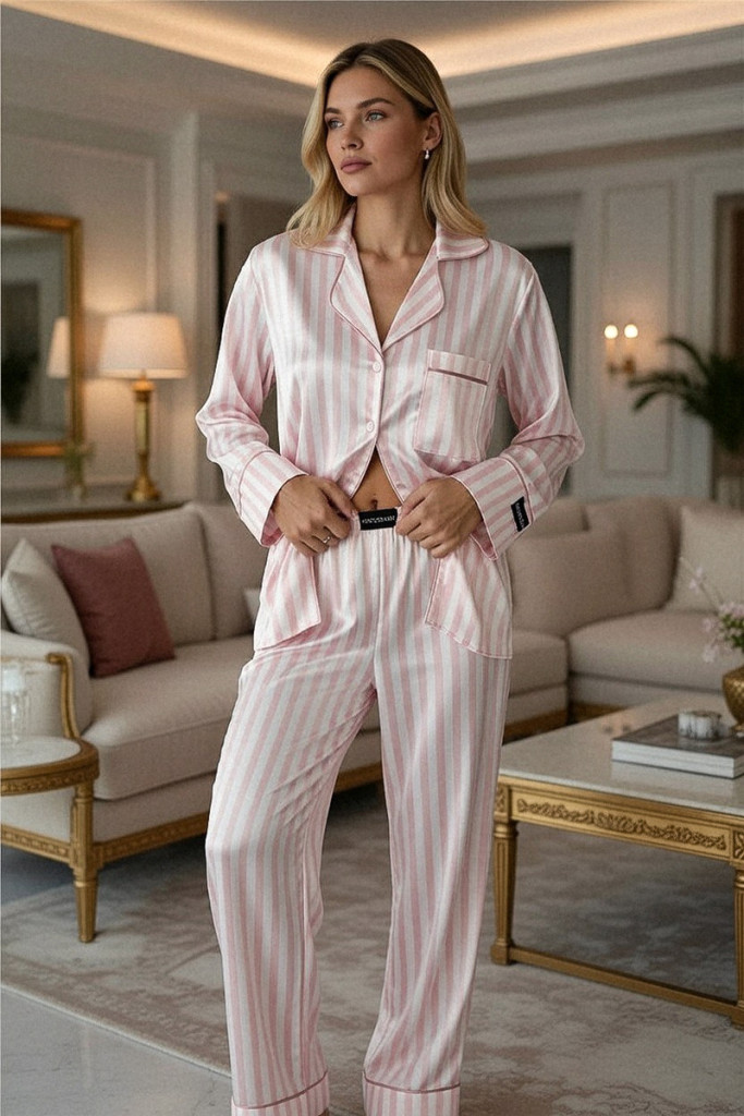 COCO rózsaszín csíkos szatén hálóruha szett kényelmes és elegáns éjszakai viselethez.