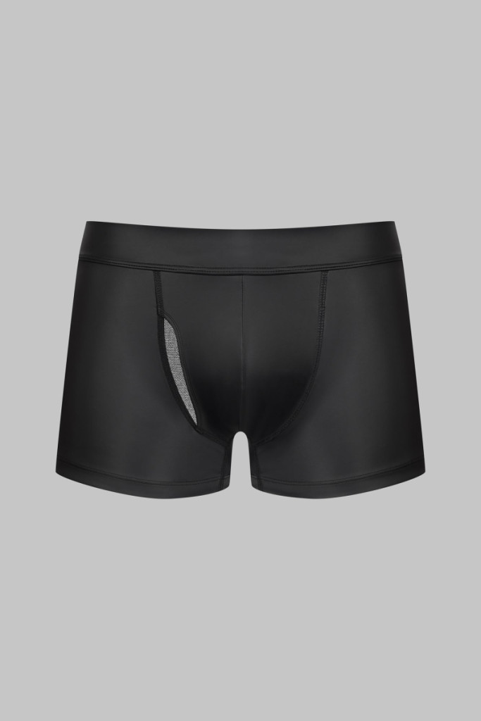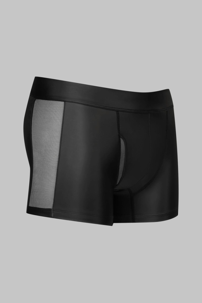 Matt bőr hatású boxerek átlátszó tüll oldalain. Testreszabott szabású és kissé rövidebb, mint a klasszikus boxerek az optimális kényelem érdekében. Lapos, testhez simuló öv a combon és a lépésbetéten a kiváló tartásért. Elöl bélés a maximális kényelem érdekében.