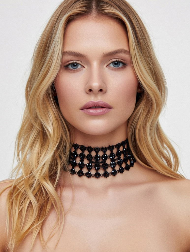 Lenyűgöző fekete choker nyaklánc, amelyet ragyogó strasszok és elegáns gyöngyök díszítenek. A csillogó részletek és a sötét alap kombinációja drámai, mégis kifinomult megjelenést kölcsönöz, tökéletesen kiemelve a nyak vonalát. Ideális választás alkalmi viselethez, estélyekhez, vagy ha szeretnél egy figyelemfelkeltő kiegészítőt.