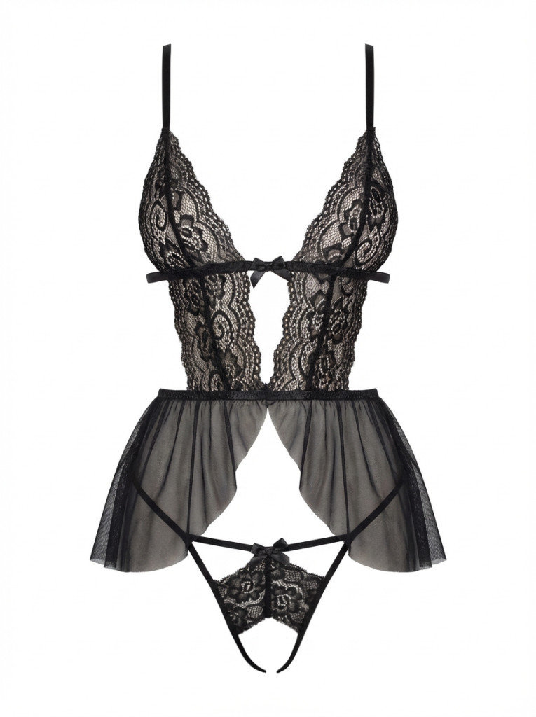 Ez a csipkés és hálós babydoll fehérnemű szett romantikus, mégis kacér megjelenést nyújt, amelyben a mélyen dekoltált csipkés felsőrész, a légiesen lebegő, áttetsző szoknya, és a hozzá illő, nyitott bugyi együtt alkotják a csábítás tökéletes kombinációját.