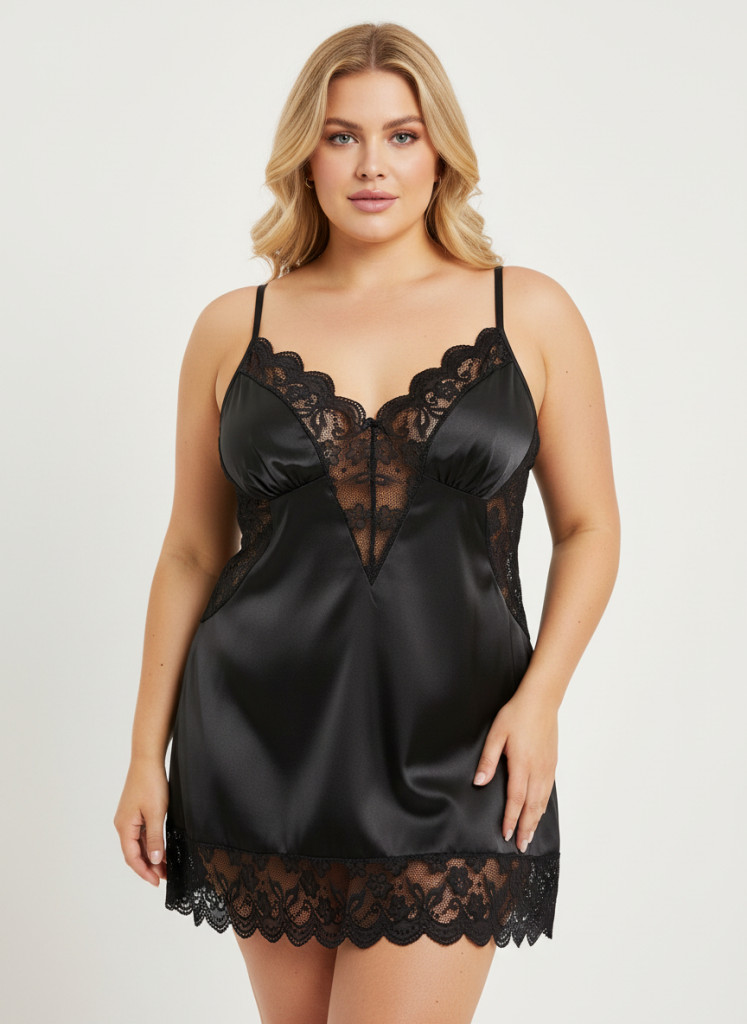 Ez a fekete plus size kombiné a nőies elegancia és a csábító részletek tökéletes egyensúlya. Selymes fényű, lágy esésű anyaga finoman simul a testre, kiemelve az alak természetes vonalait, miközben kényelmes viseletet biztosít egész este.