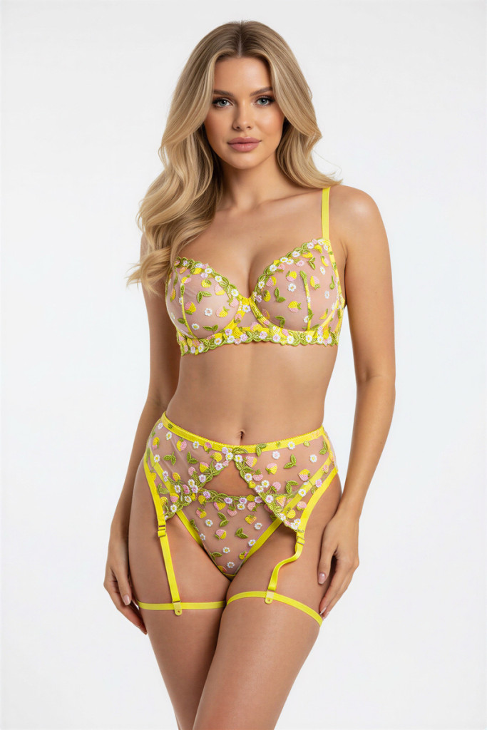 Citromsárga virágos hímzett merevítős harisnyatartós szett