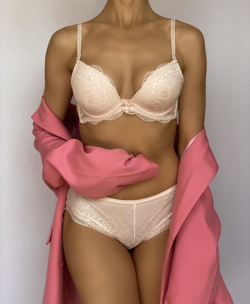 Embrace púder csipkés brazil bugyi, amely a finom eleganciát és a nőiességet ötvözi. A halvány rózsaszín árnyalatú, rugalmas csipke lágyan simul a testre, miközben a brazil fazon kiemeli a nőies vonalakat és kényelmes viseletet biztosít egész napra. Ez a kifinomult darab egyszerre érzéki és diszkrét, tökéletes választás minden alkalomra.