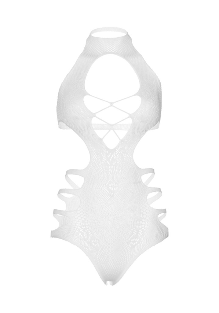 Merész és egyedi body finom csipkéből és élénk fehér pántokkal, amely igazán különlegessé teszi megjelenésed. Rugalmas anyaga tökéletesen követi a test vonalait, kényelmes viseletet biztosítva.