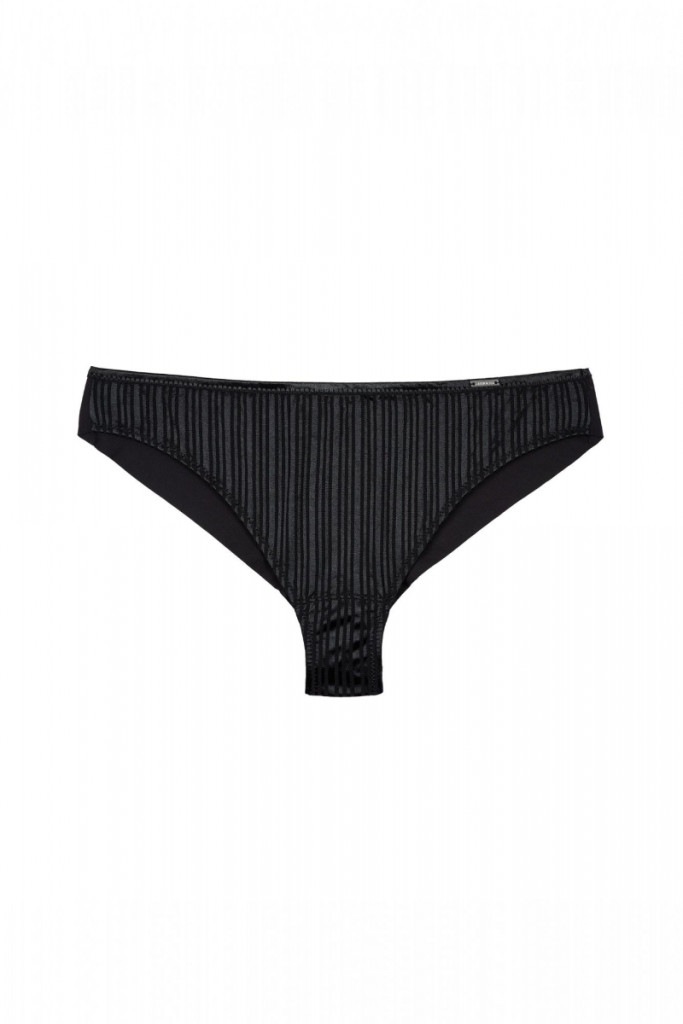 Fekete csíkos brazil bugyi kényelmes fazonnal, elegáns és praktikus viseletre.