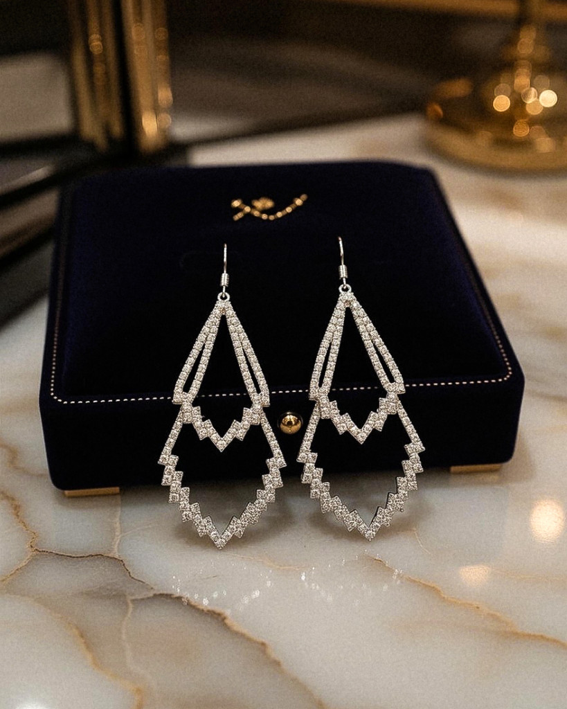 Ez az exkluzív ezüstös fülbevaló kifinomult megjelenésével és finom csillogásával a luxus érzetét kelti. Letisztult formája és elegáns ezüstös árnyalata tökéletes választás azok számára, akik a különleges részleteket és az időtálló stílust keresik. Viselheted ünnepi alkalmakra vagy a mindennapok elegáns kiegészítőjeként is.