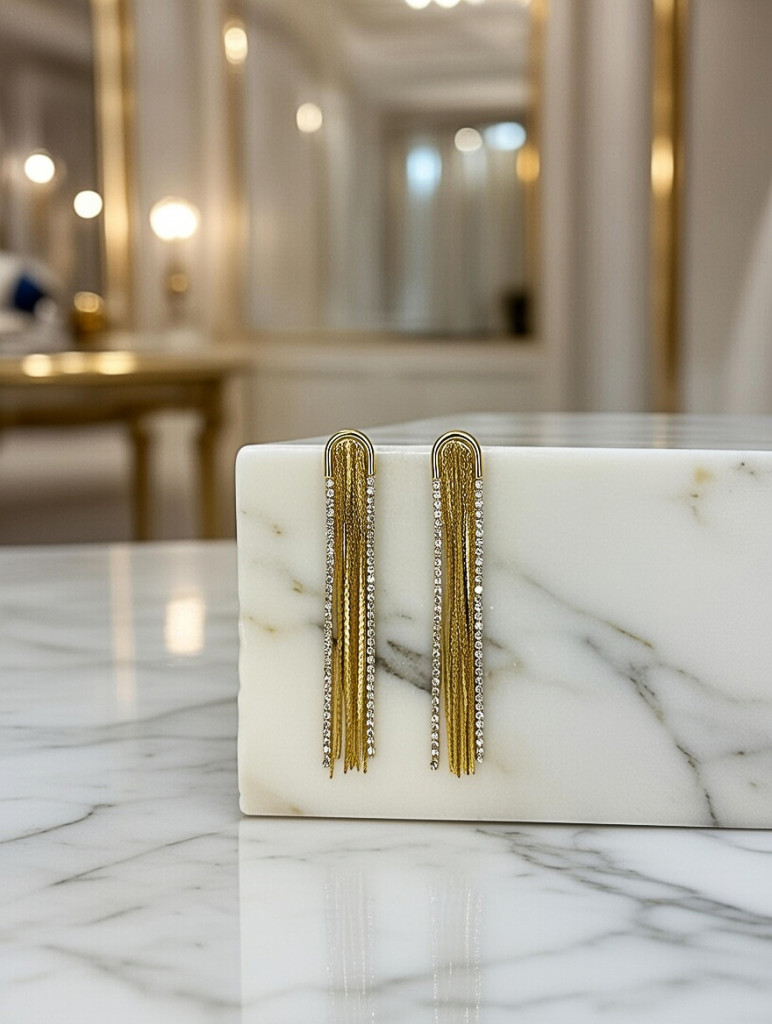 Ragyogj kifinomult eleganciával ezzel az arany színű strasszos lógós fülbevalóval. A finoman csillogó strasszok gyönyörűen visszaverik a fényt, míg a lógós kialakítás nőiesen keretezi az arcot, kiemelve a vonásaidat. Könnyed és elegáns kiegészítő, amely bármilyen alkalmi vagy különleges outfitet azonnal feldob.