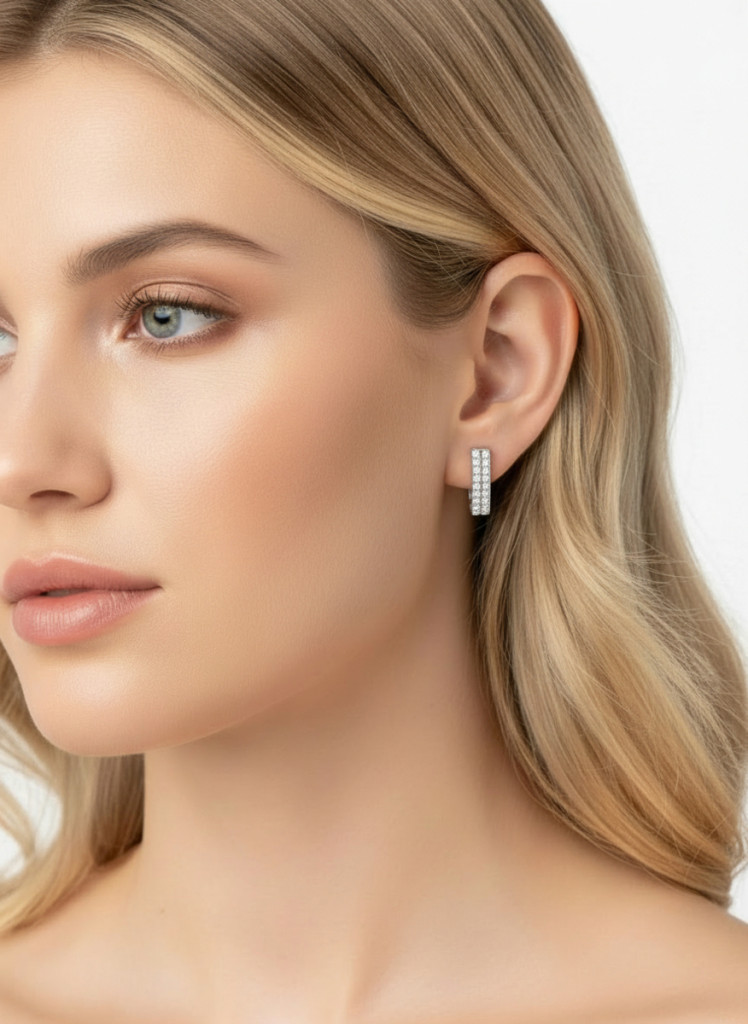 Tedd még ragyogóbbá megjelenésed ezzel az ezüst színű, dupla soros strasszos fülbevalóval. A két sorban elhelyezett, finoman csillogó strasszok látványos, mégis elegáns hatást keltenek, így garantáltan magukra vonzzák a tekintetet. A letisztult, mégis különleges kialakítás tökéletesen kiegészíti mind az alkalmi, mind a hétköznapi outfiteket.
