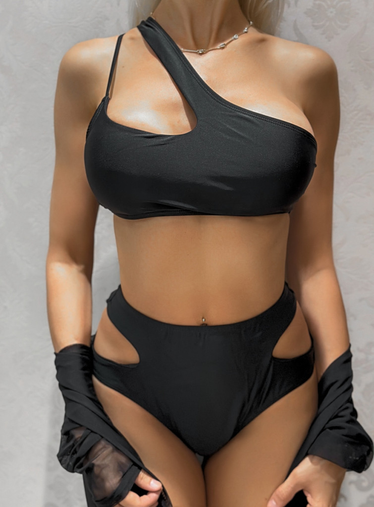 Különleges kivágott részekkel, pántmegoldással készült. Rugalmas, erős anyagból készült. Kivehető szivacsbetét a mellrésznél. Nagyon jól tart. Igazán különleges bikini szett!