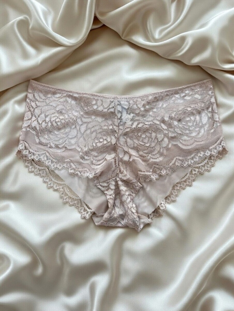 Gyönyörű csipkés hipster bugyi. Kényelmes, nincsen benne gumi. Nagyn szép pasztelles-púderes színe van.
