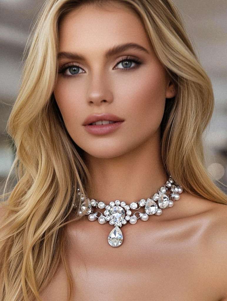 Elegáns choker nyaklánc ezüst kövekkel és gyöngyökkel díszítve. A csillogó kövek és a finom gyöngyök kombinációja kifinomult és nőies megjelenést kölcsönöz, miközben a choker stílus modern, figyelemfelkeltő hatást ad. Ideális választás alkalmi viselethez vagy amikor egy elegáns, mégis karakteres kiegészítőt szeretnél.
