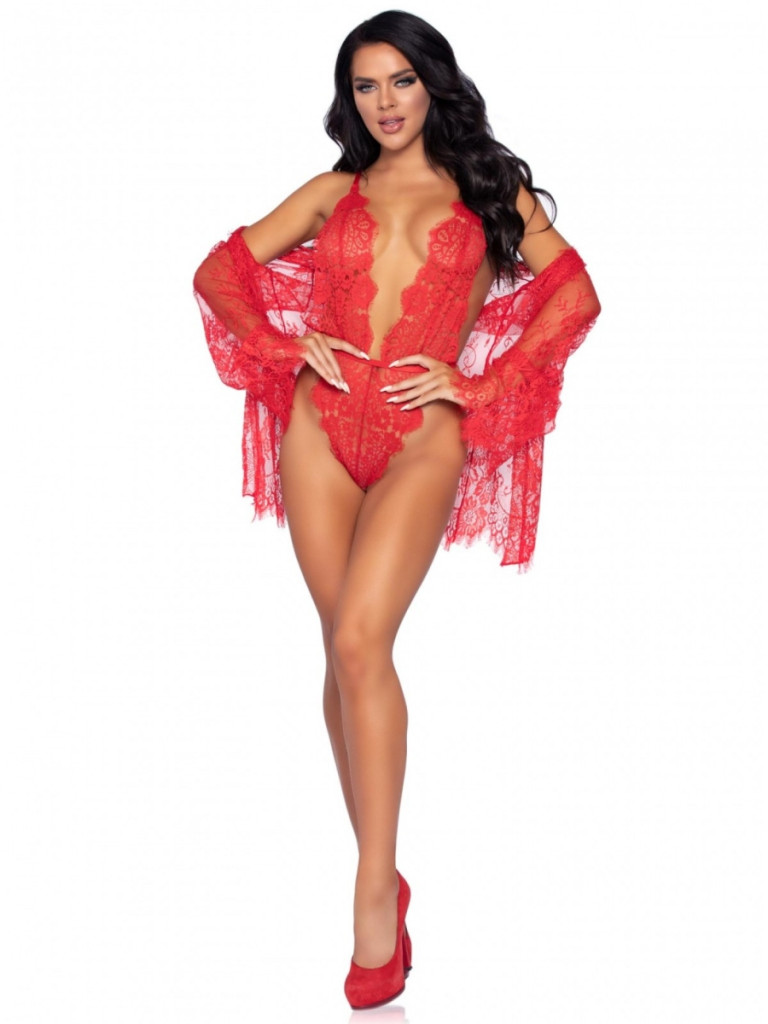 Piros csipke teddy & kimonó szett elegáns és kényelmes kialakítással.