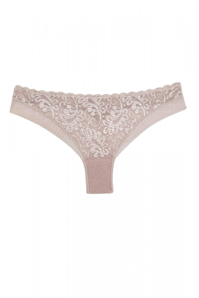 Brazil szabású csípőbugyi. A hátsó rész gumi nélkül, dupla elasztikus tüllből készült, ezért nem vágja a combot. Optikailag keskenyíti az alakot, testhezálló ruha alá is megfelelő választás.