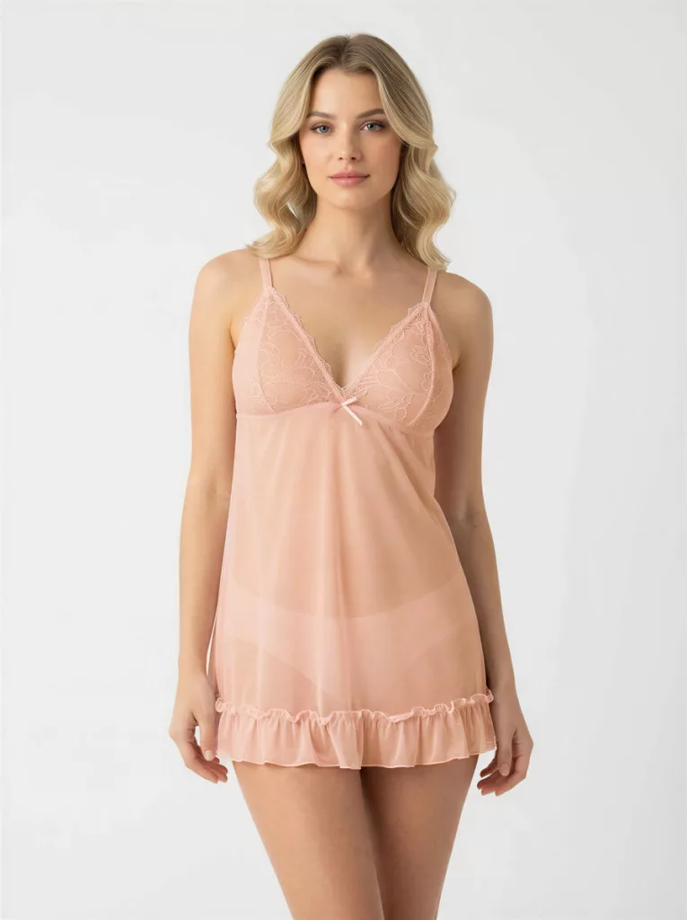 Rózsaszín soft csipkés kombiné szett, gyönyörű barackos árnyalatban, amely egyszerre sugároz gyengédséget és érzékiséget. Extra puha, finom csipkéből készült, merevítő és szivacs nélküli kialakítása pedig maximális kényelmet biztosít. Könnyed viselete természetesen simul a testre, miközben nőies és nőies megjelenést kölcsönöz. A hozzáillő G-string tanga teljessé teszi az összhatást.