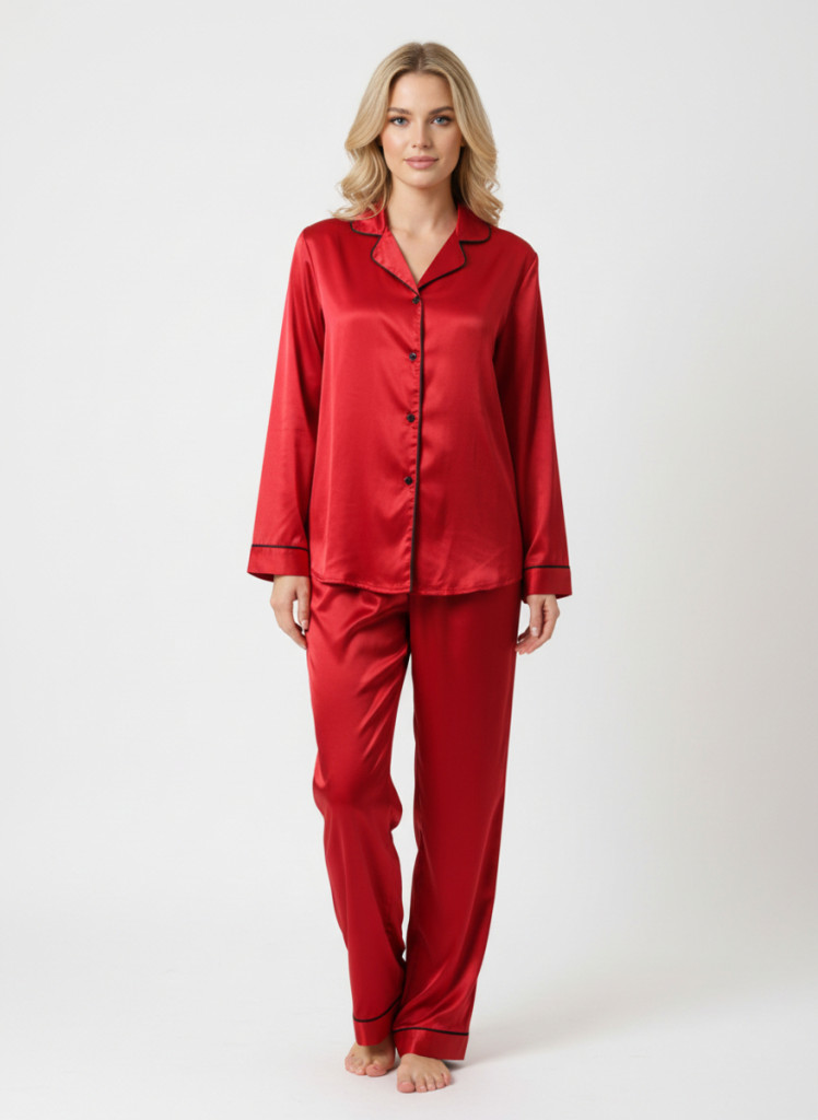 Elegáns, finoman fénylő szatén anyagból készült pijama szett, amely a klasszikus stílust és a kényelmet ötvözi. A gombos felsőrész letisztult megjelenést ad, míg a hosszú nadrág laza, kellemes viseletet biztosít pihenés közben. A piros szín karakteres, mégis nőies hangulatot kölcsönöz a szettnek, így ideális választás az esti kikapcsolódáshoz.