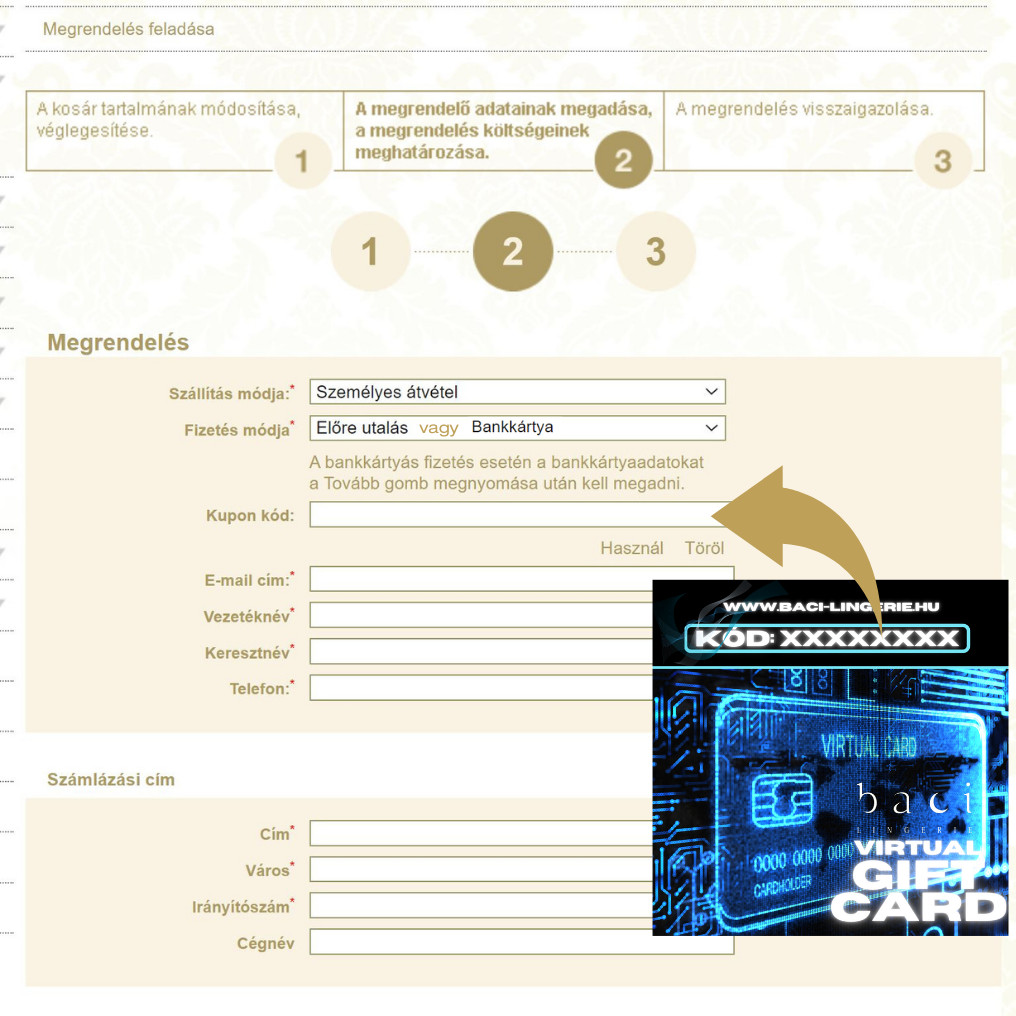 A BACI LINGERIE gondol azokra a vásárlóira is, akik a világ legnőiesbb fehérneműjét ONLINE kívánják ajándékozni, de bizonytalanok azt illetően, hogy melyik stílust vagy méretet is válasszák. Ezért a Baci Lingerie bevezette VIRTUÁLIS AJÁNDÉKKÁRTYÁJÁT. A virtuális ajándékkártya egy kódot tartalmaz (melyet elektronikus úton küldünk el), és a webáruházban történő vásárláskor használhat fel a megajándékozott. A virtuális ajándékkártya legalább akkora örömet fog okozni a megajándékozottnak, mint maga a fehérnemű.