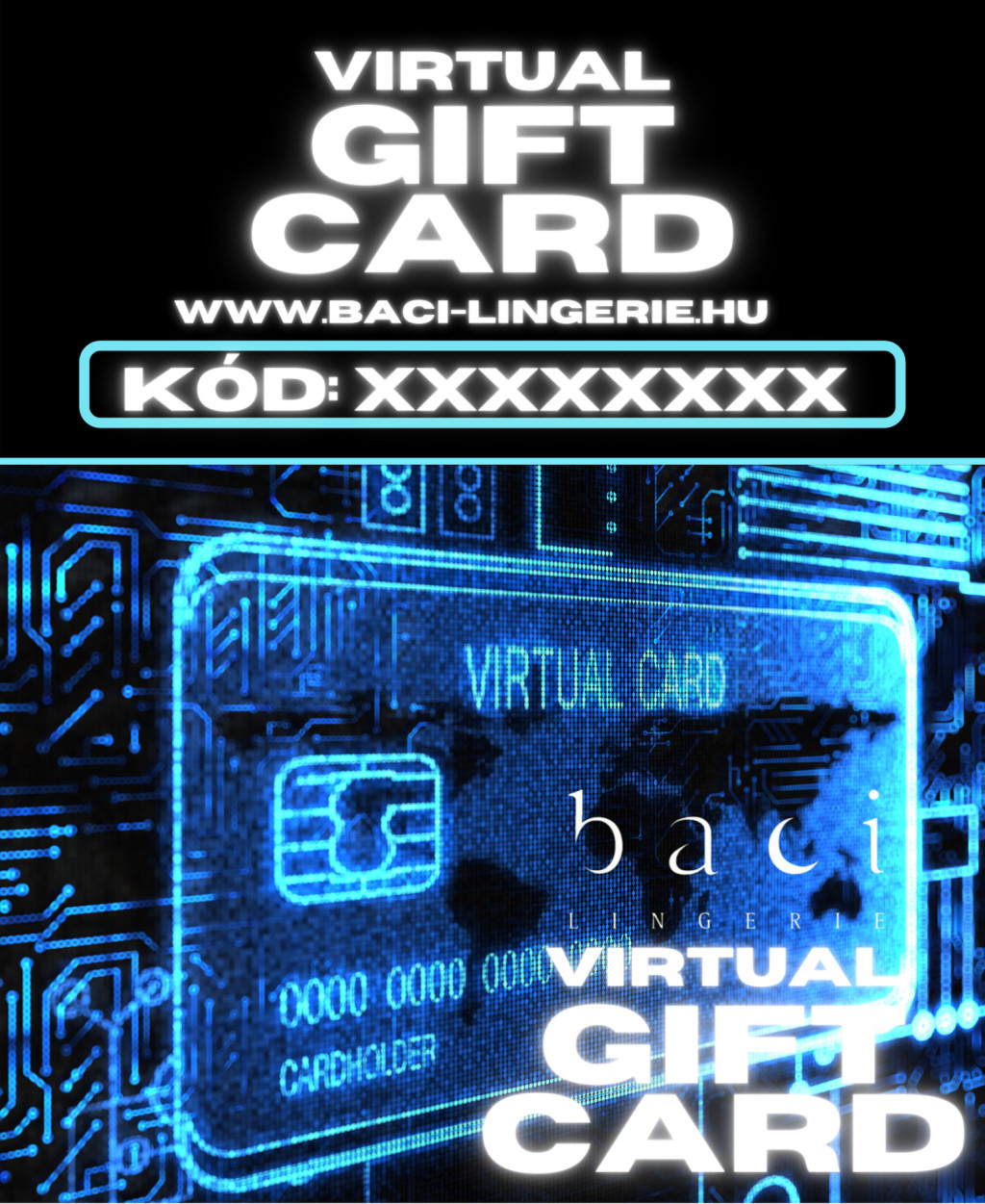 A BACI LINGERIE gondol azokra a vásárlóira is, akik a világ legnőiesbb fehérneműjét ONLINE kívánják ajándékozni, de bizonytalanok azt illetően, hogy melyik stílust vagy méretet is válasszák. Ezért a Baci Lingerie bevezette VIRTUÁLIS AJÁNDÉKKÁRTYÁJÁT. A virtuális ajándékkártya egy kódot tartalmaz (melyet elektronikus úton küldünk el), és a webáruházban történő vásárláskor használhat fel a megajándékozott. A virtuális ajándékkártya legalább akkora örömet fog okozni a megajándékozottnak, mint maga a fehérnemű.
