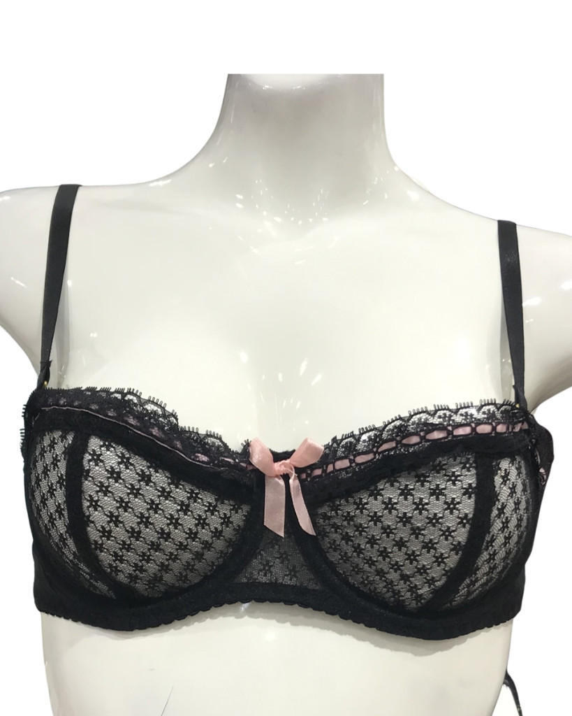 Fekete előformázott melltartó mintás tüll-anyagból, csipke-bordűrökkel, világos-rózsaszín szatén-szalagokkal. kényelmes és nőies mindennapi viselethez.