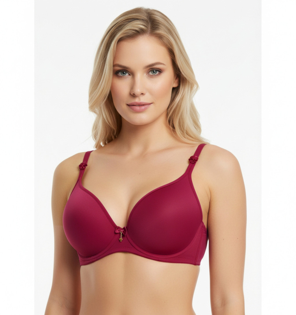 Bordó-vörös melltartó párnázott kosarakkal, előformázott és masnis kényelmes és nőies mindennapi viselethez.