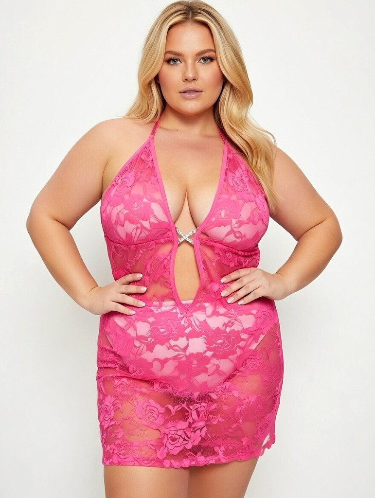 Rózsaszínszínű plus size csipkés kombiné mély V-kivágással elegáns és kényelmes kialakítással.