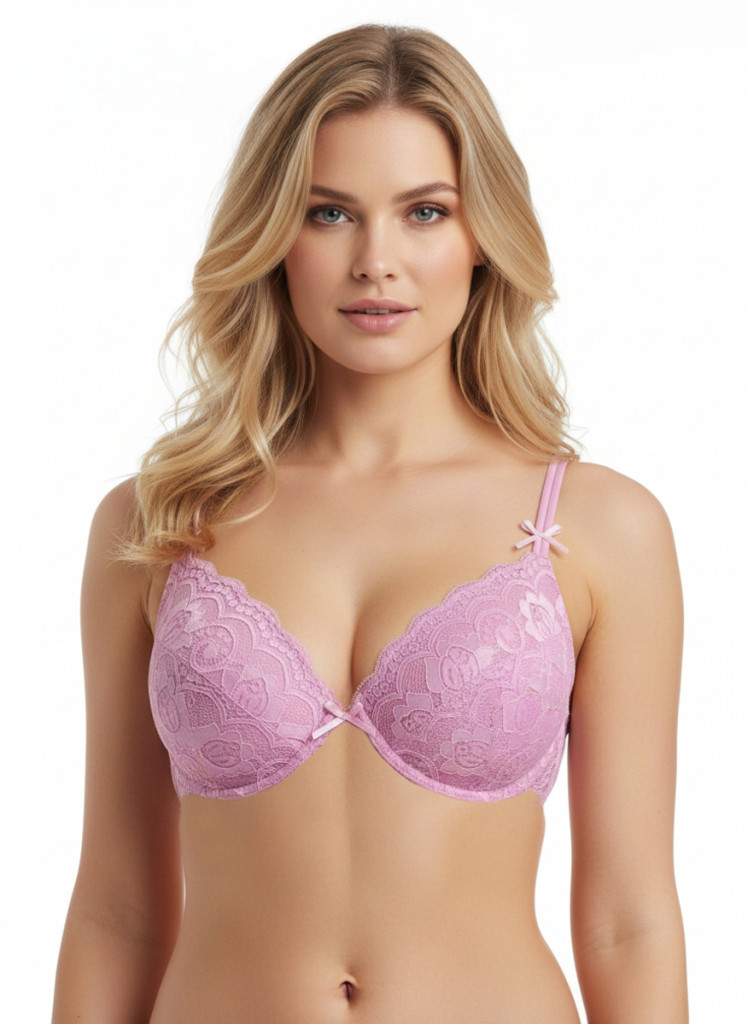 Csipke-rátétekkel díszített előformázott rózsaszín melltartó párnázott kosarakkal kényelmes és nőies mindennapi viselethez.