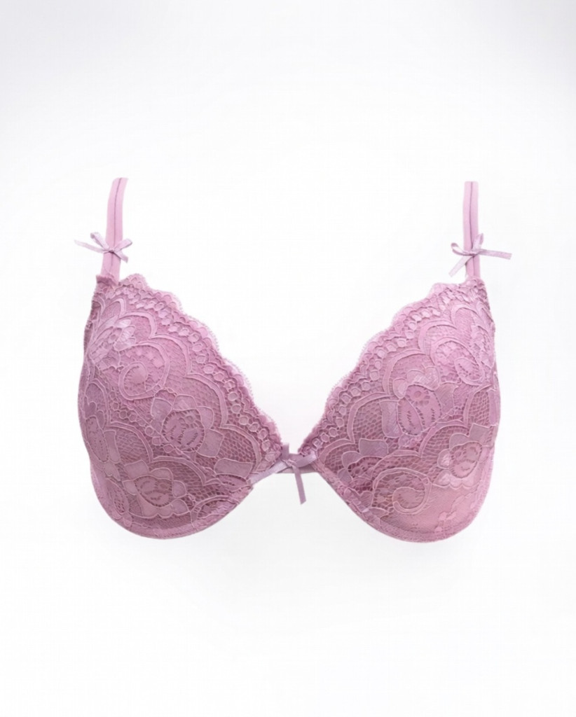 Csipke-rátétekkel díszített előformázott rózsaszín melltartó párnázott kosarakkal