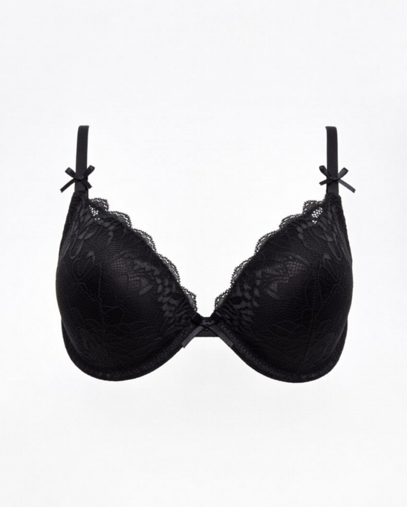 Fekete csipke-melltartó párnázott kosarakkal, előformázott és masni kényelmes és nőies mindennapi viselethez.
