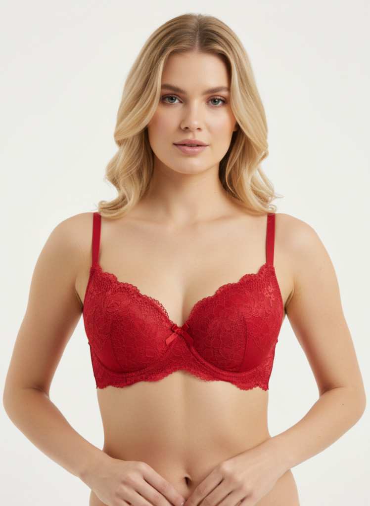 Romance piros csipkés push-up melltartó a szenvedély és a nőiesség tökéletes kombinációja. Finom, részletgazdag csipkéje elegáns, romantikus megjelenést kölcsönöz, míg a push-up kosarak gyönyörűen formálják és kiemelik a dekoltázst.