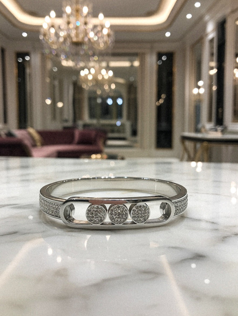 Ez az ezüst színű nemesacél karkötő csillogó kövekkel díszített, amelyek elegánsan emelik ki a csuklót. A tartós nemesacél alap biztosítja a hosszú élettartamot és a kényelmes viseletet, miközben a kövek finom fényt adnak minden mozdulatnak.