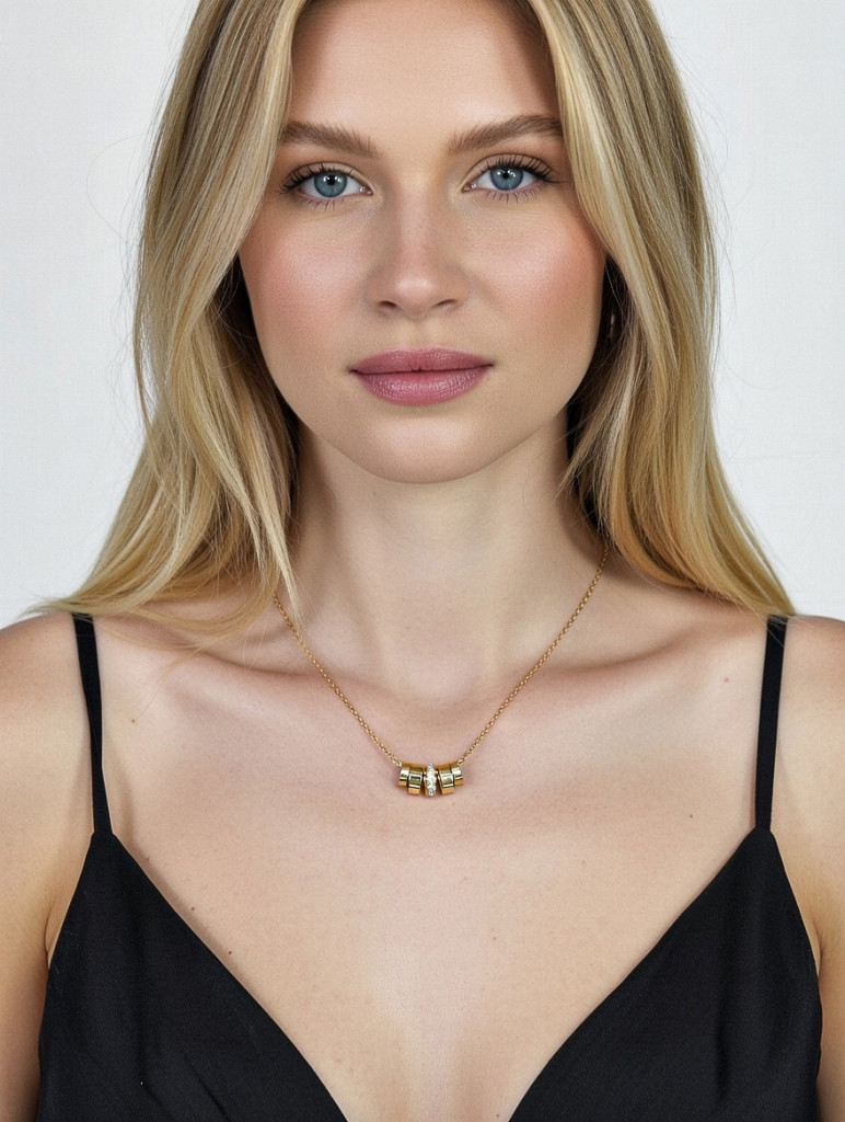Elegáns arany színű ékszerszett, amely tartalmaz egy finom nyakláncot és hozzá illő fülbevalókat, a nyakláncot stílusos karika medálok díszítik. Letisztult, mégis figyelemfelkeltő kialakítása ideális választás mindennapi viselethez vagy különleges alkalmakra. Könnyen kombinálható más ékszerekkel, így sokoldalú kiegészítője lehet a ruhatáradnak.
