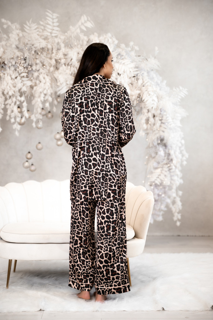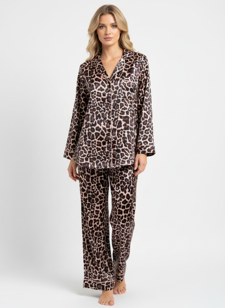 Luxus érzetű, leopárd mintás szatén hálóruha szett, amely egyszerre kényelmes és stílusos.