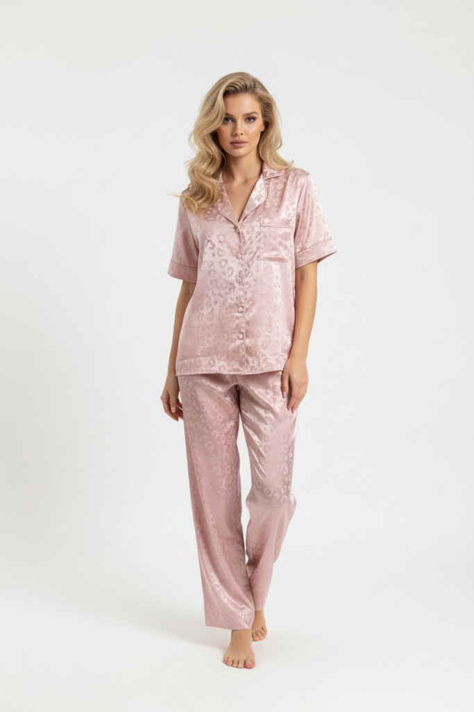 Finom, nőies megjelenésű rózsaszín szatén hálóruha szett, amely a romantikus stílust és a kényelmet ötvözi. A szett egy gombos felsőrészből és egy hosszú nadrágból áll, melyek harmonikus, elegáns összhatást alkotnak. A selymes tapintású, könnyed szatén anyag nem feszül, kellemes viseletet biztosít, míg a laza szabás maximális komfortot és szabad mozgást nyújt. A finom rózsaszín alapon elhelyezett leopárd mintás design divatos, karakteres, mégis nőies hangulatot kölcsönöz a szettnek, így tökéletes választás az esti kikapcsolódáshoz vagy különleges pillanatokhoz.