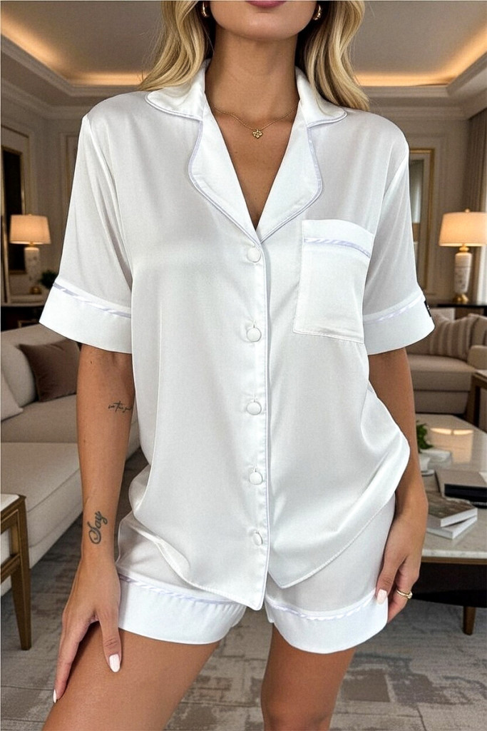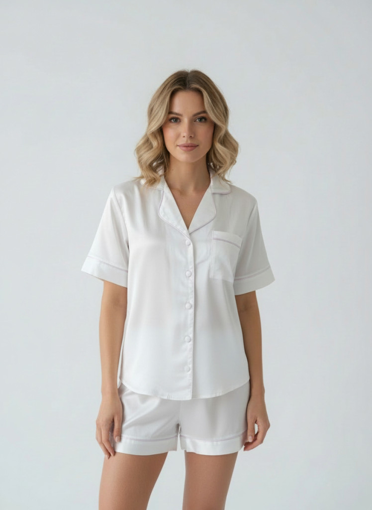 COCO fehér szatén hálóruha short szett kényelmes és elegáns éjszakai viselethez.