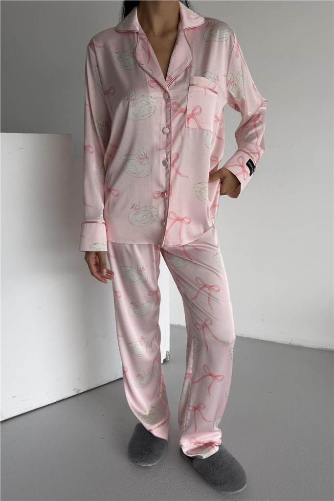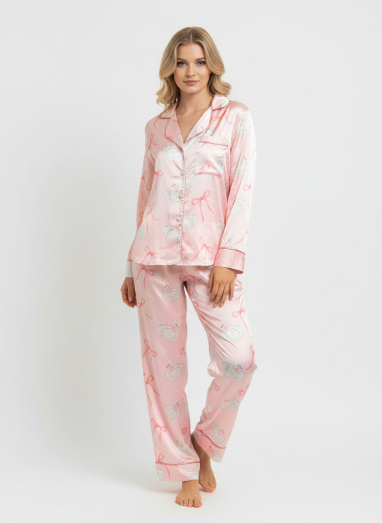 Kifinomult megjelenésű, hattyú mintás szatén hálóruha szett, amely tökéletes egyensúlyt teremt az elegancia és a kényelem között.