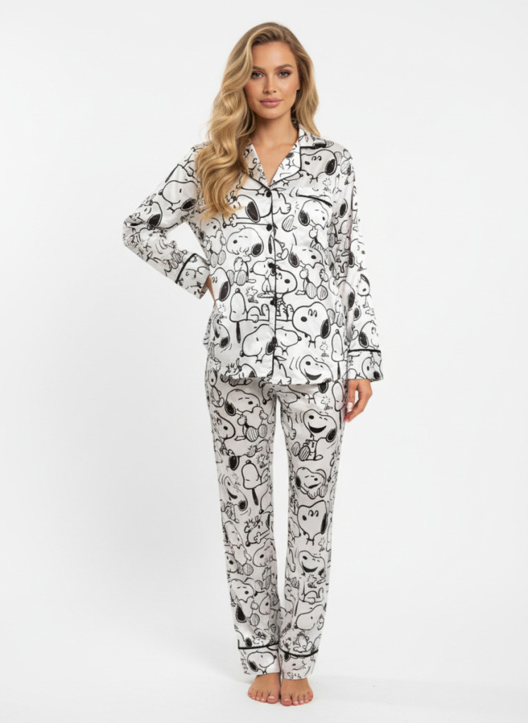 Finoman fénylő szatén anyagból készült hálóruha szett, amely ötvözi a kényelmet és a játékos stílust. A vidám Snoopy mintás design nőies, karakteres megjelenést kölcsönöz, miközben a laza, könnyed szabás maximális kényelmet és szabad mozgást biztosít az otthoni pihenéshez vagy nyugodt esti kikapcsolódáshoz. Ideális választás, ha szereted a stílusos, mégis játékos mintákat a hálószobában.