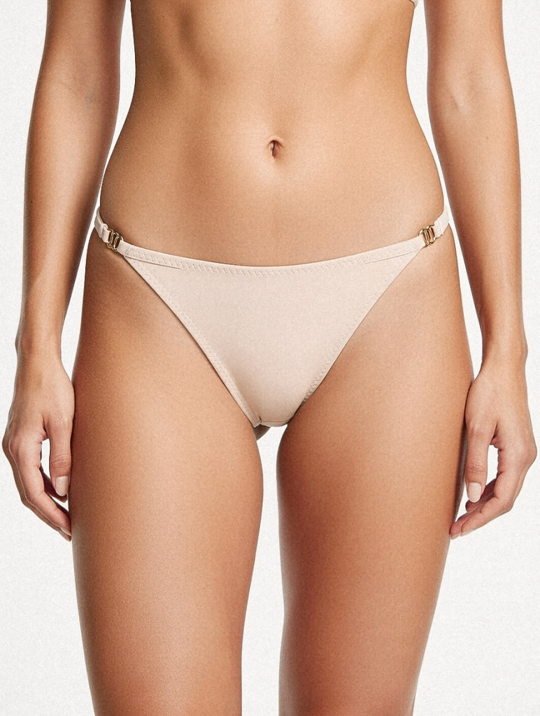 Ez a klasszikus testszínű tanga a minimalizmus és a kényelem tökéletes kombinációja, három apró arany karikával díszítve. Puha, rugalmas anyaga gyengéden simul a testhez, így láthatatlan marad a ruházat alatt, miközben nőies és kényelmes viseletet biztosít egész napra. Ideális választás mindennapi használatra, amikor a diszkrét megjelenés a legfontosabb.