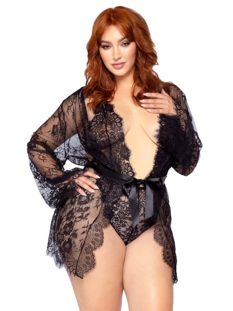 Csipkés Plus Size Teddy & Kimonó Szett – Fekete