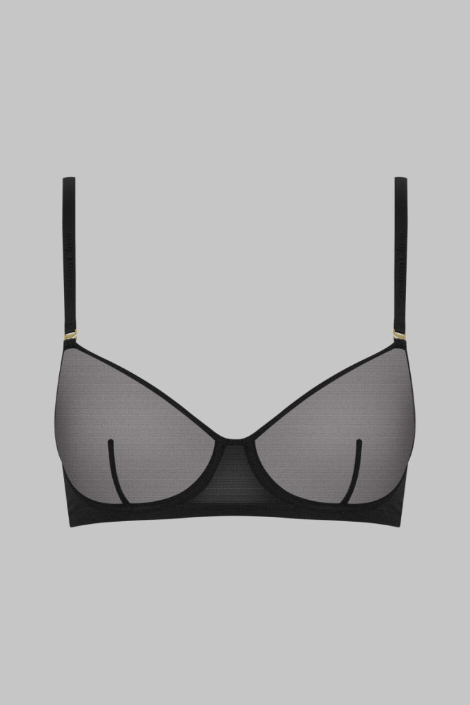 Ez a fekete merevítős melltartó puha tüll anyagból készült, amely áttetsző, finom és elegáns megjelenést biztosít. A merevítő stabil tartást nyújt, miközben a légies tüll érzéki hatást kölcsönöz. Hátul kényelmes kapoccsal rögzíthető, az állítható vállpántok pedig lehetővé teszik az egyéni igényekhez igazított illeszkedést.